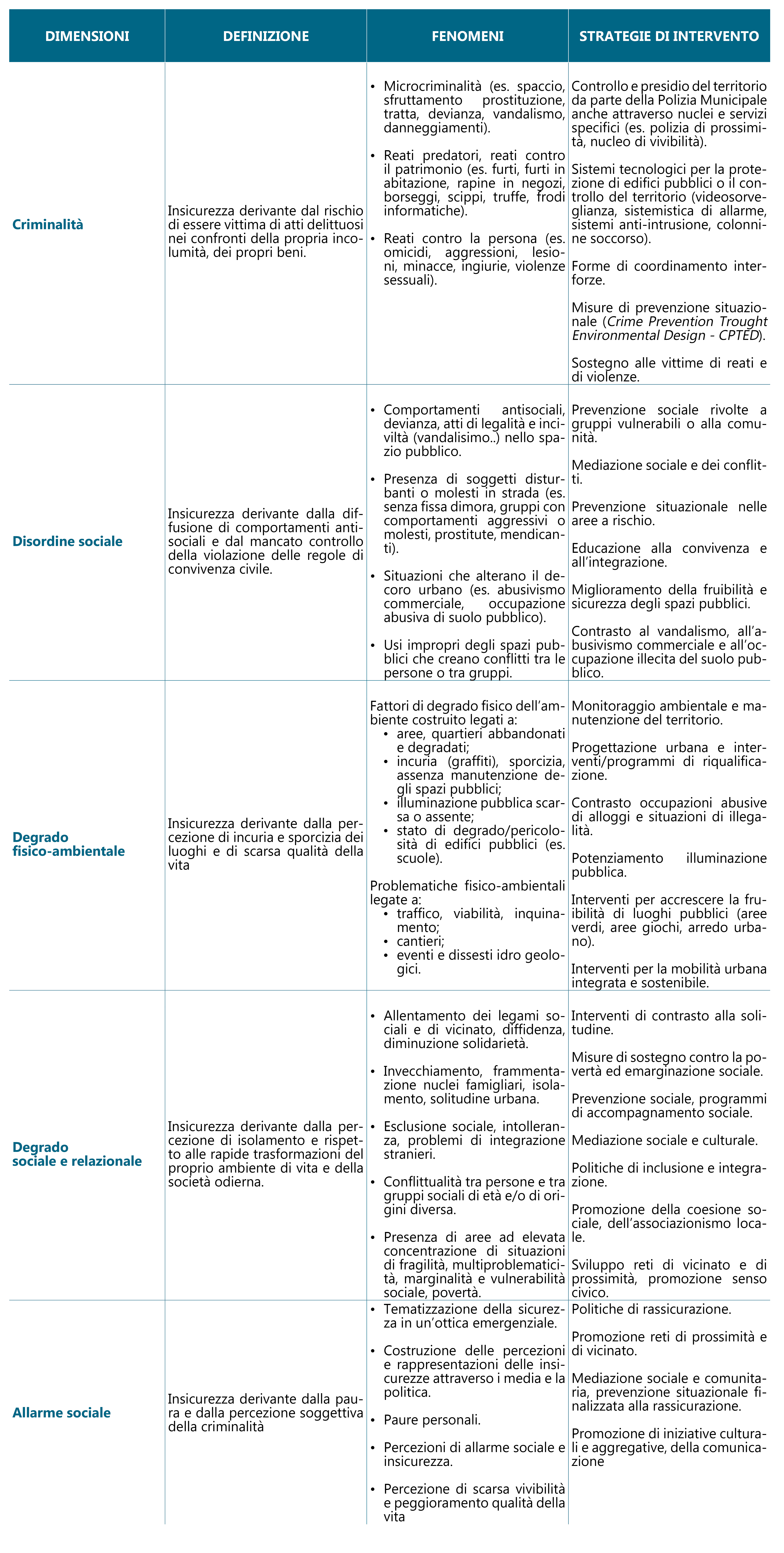 Il tema dell'insicurezza si riferisce a un insieme di fenomeni diversi tra di loro. Qui si propone una classificazione di tali fenomeni e le possibili strategie di intervento che un Ente locale può intraprendere per affrontarli correttamente.